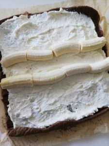 Raširite biskvit na radnoj površini.Premažite većinu kreme te složite 4 banane da su spojene. Rolajte svaku stranu da dobijete rolat sa dva „mačja oka” od banana. Ostatak kreme premažite te pospite mljevenim lješnjacima ili mrvicama čokolade. Ostavite da se ohladi 3 sata i poslužite.