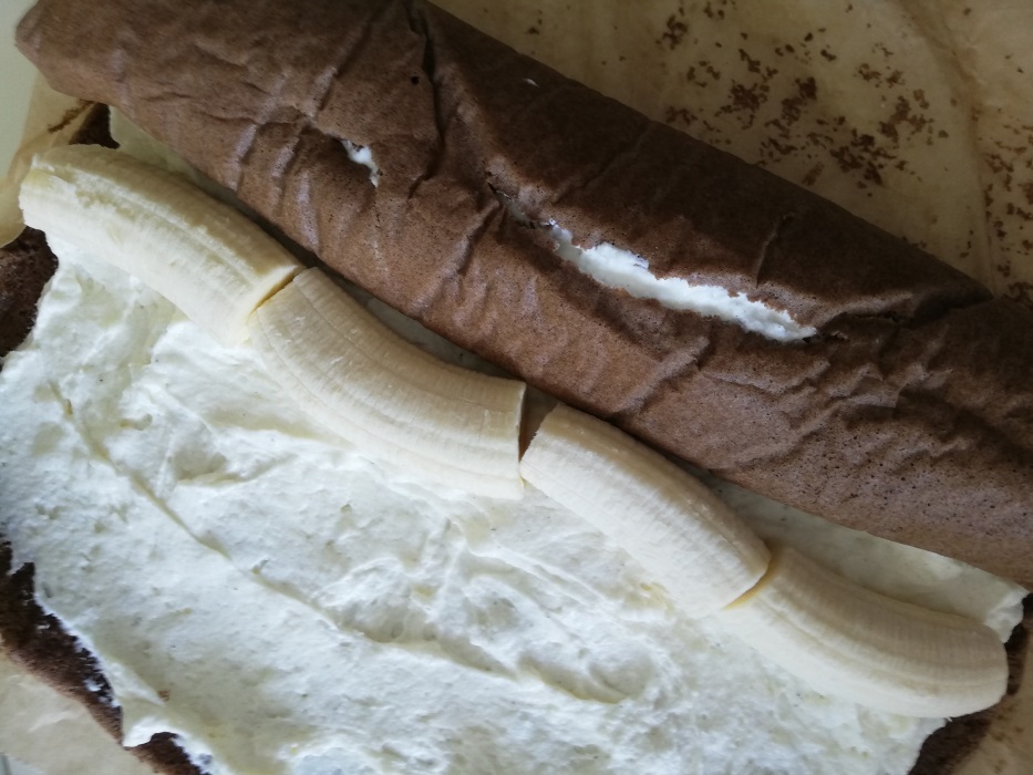 Raširite biskvit na radnoj površini.Premažite većinu kreme te složite 4 banane da su spojene. Rolajte svaku stranu da dobijete rolat sa dva „mačja oka” od banana. Ostatak kreme premažite te pospite mljevenim lješnjacima ili mrvicama čokolade. Ostavite da se ohladi 3 sata i poslužite.