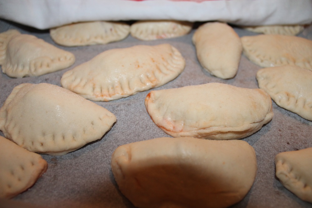 img_4486Zatim sam ga izvaljala i čašom rezala krugove. U svaki krug sam stavila komadić paprike, sira i špeka i malo polila s malo pasirane rajčice. Presavinula sam krug i vilicom polijepila rub da rajčica ne curi, a da ima lijepi oblik. Calzone sam složila na papir za pečenje te ostavila da se dignu još malo cca 20 minuta. Prije pečenja, premazala sam ih zamućenim žumanjkom i posipala origanom. Za to vrijeme sam zagrijala pećnicu na 200°C. Pekla sam ih 20ak minuta dok nisu porumenili. Odmah smo ih pojeli. Mljac!